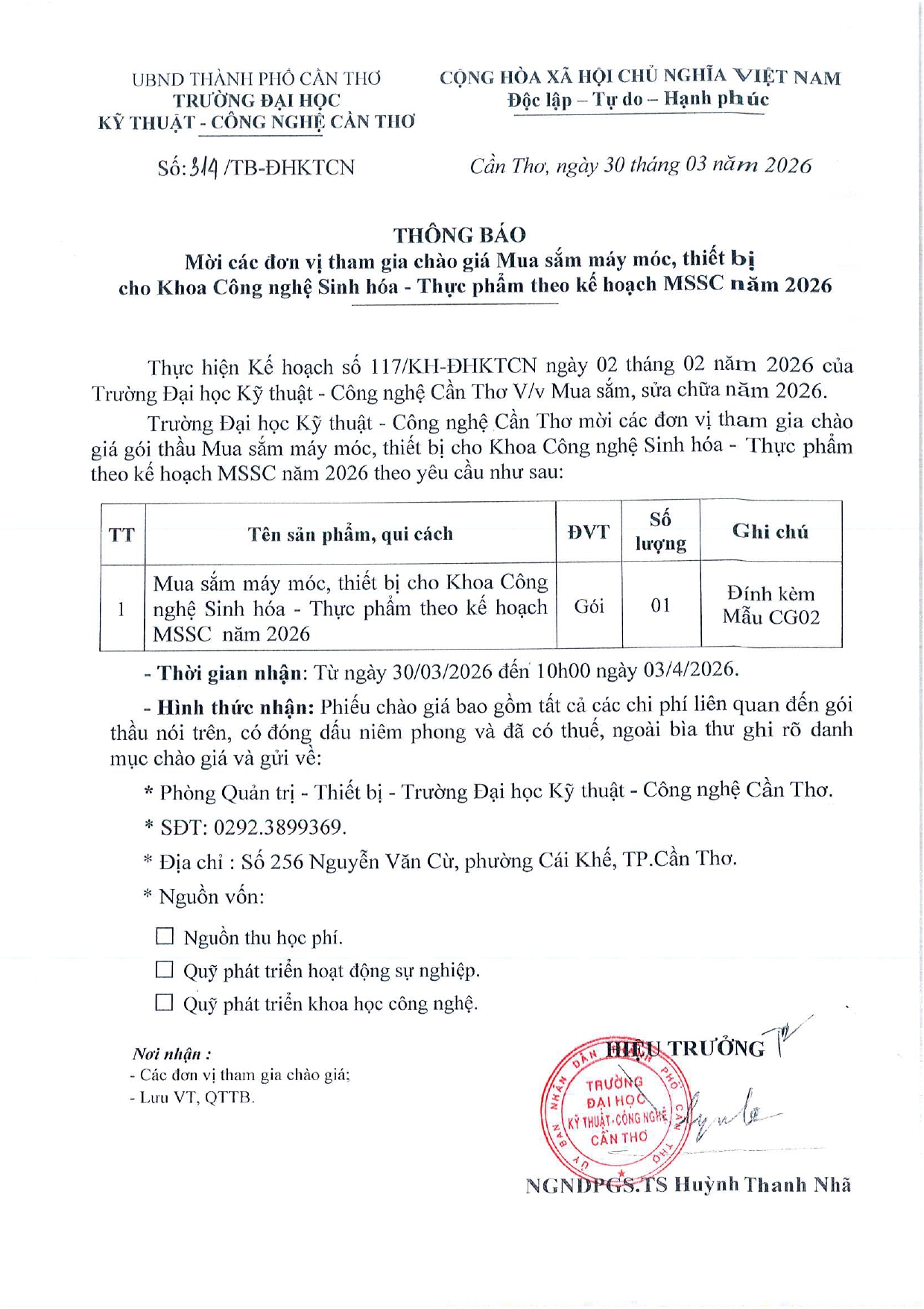 TB 314 Chào giá mua sắm máy móc thiết bị cho khoa CN SH-TP theo KH MSSC 2026_page-0001 Đăng vào 31 Tháng Ba, 2026Tác giả Nguyễn Minh Thiệp 0